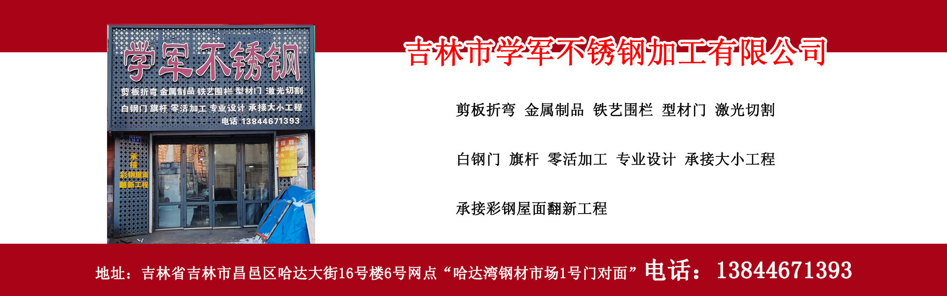 吉林市學(xué)軍不銹鋼加工有限公司專業(yè)從事吉林市不銹鋼加工制作、吉林市白鋼門制作、吉林市白鋼隔斷制作、吉林市剪板折彎、激光切割、型材門、電子感應(yīng)門、旗桿制作、彩鋼屋面翻新、吉林市鐵藝圍欄加工制作等吉林市不銹鋼加工制作、吉林市金屬加工制作服務(wù)單位,位于吉林省吉林市。